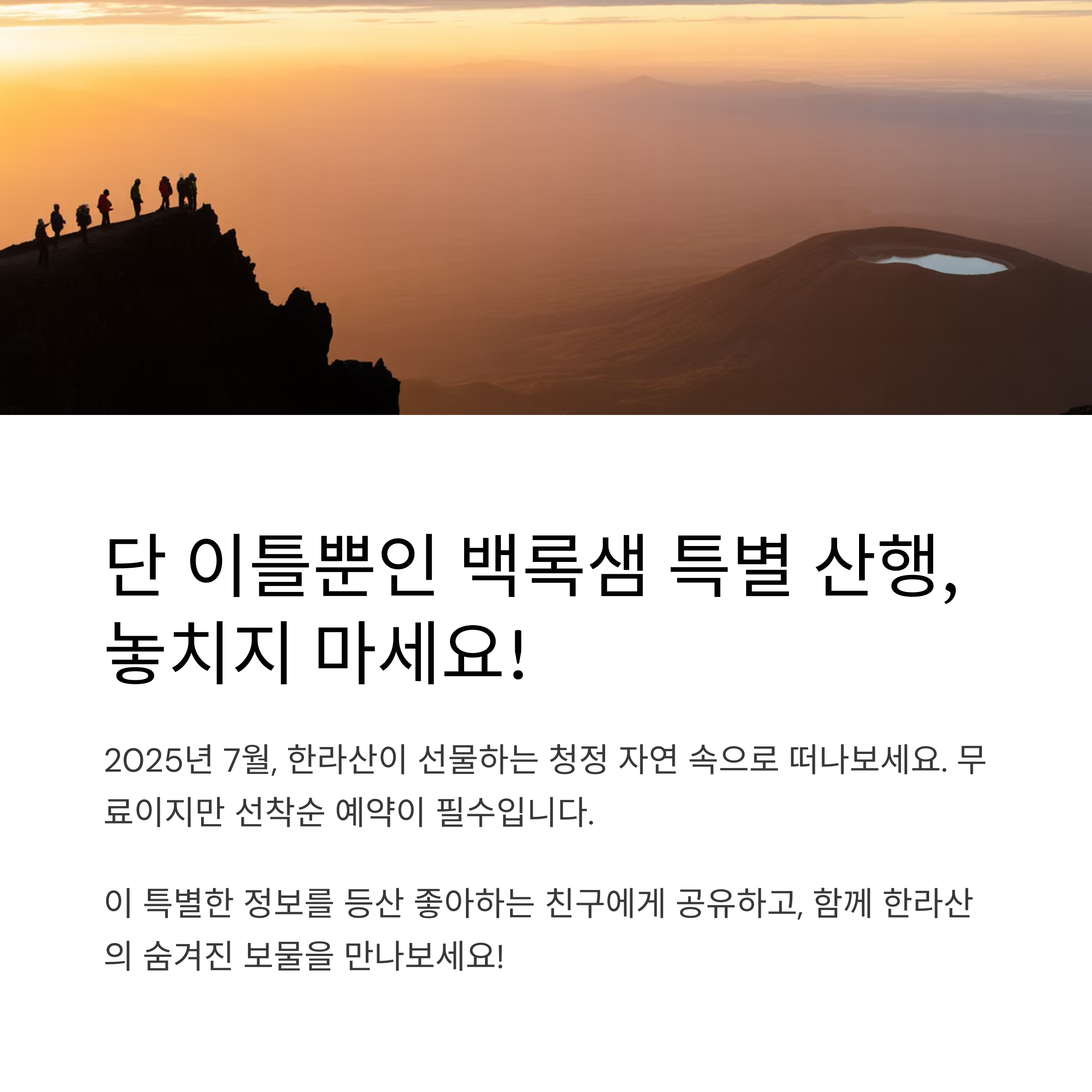 2025년 7월 단 이틀, 백록샘을 직접 만나볼 수 있는 특별한 기회가 찾아옵니다. 무료이지만 선착순 예약이 필수인 만큼, 일정 체크 후 예약에 서두르세요! 한라산이 선물하는 청정 자연 속으로 지금 바로 떠나보세요.아래 버튼을 눌러 예약 꿀팁과 산행 정보까지 한 번에 확인해보세요.사전예약 바로가기 위 버튼 누르시면 예약 홈페이지로 이동합니다